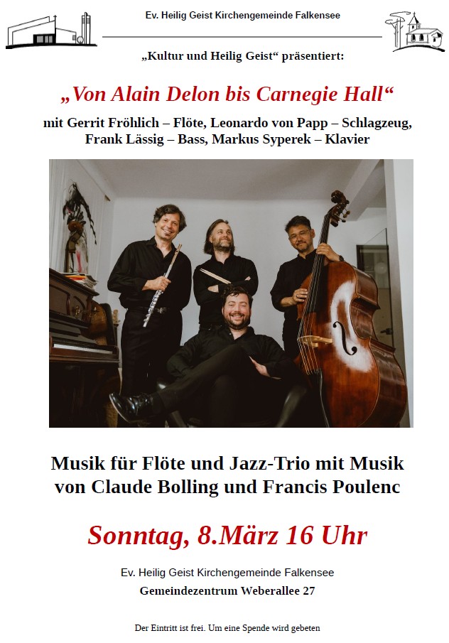 „Von Alain Delon bis Carnegie Hall“ mit Musik des Jazzpianisten Claude Bolling (eine Mischung aus Jazz, Klassik und Filmmusik) und Francis Poulenc für Flöte und Jazztrio